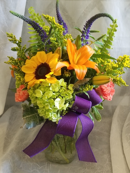 This clear glass vase arrangement has sunflowers,lillies, green hydrangea, veronica, soildago, orange carnations with assorted greenery and a purple ribbon.