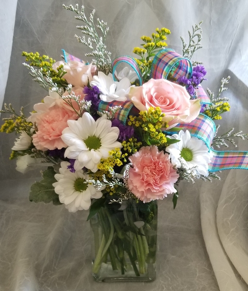 This clear glass vase has spray roses, roses, pink carnations, white daisies, solidago, caspia, purple statice and assorted greenery with a matching bow.